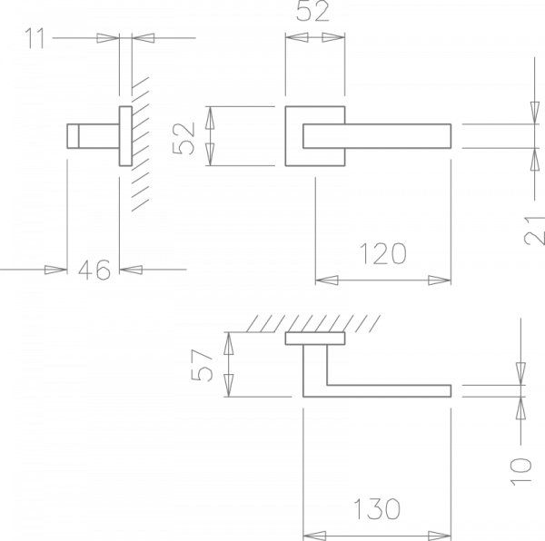 Puxador par. Espelho quadrado de 52mm. Fácil encaixe em adaptador metálico com sistema “click”. Mola recuperadora reversível. Ferro quadrado de 8x100mm. Fixação da muleta por perno roscado M6 oculto. Equipado com espelho.