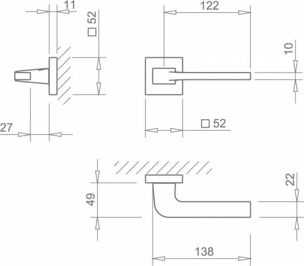 Curva Line. Puxador par. Espelho quadrado de 52mm. Fácil encaixe em adaptador metálico com sistema “click”. Mola recuperadora reversível. Ferro quadrado de 8x100mm. Fixação da muleta por perno roscado M6 oculto. Equipado com espelho.